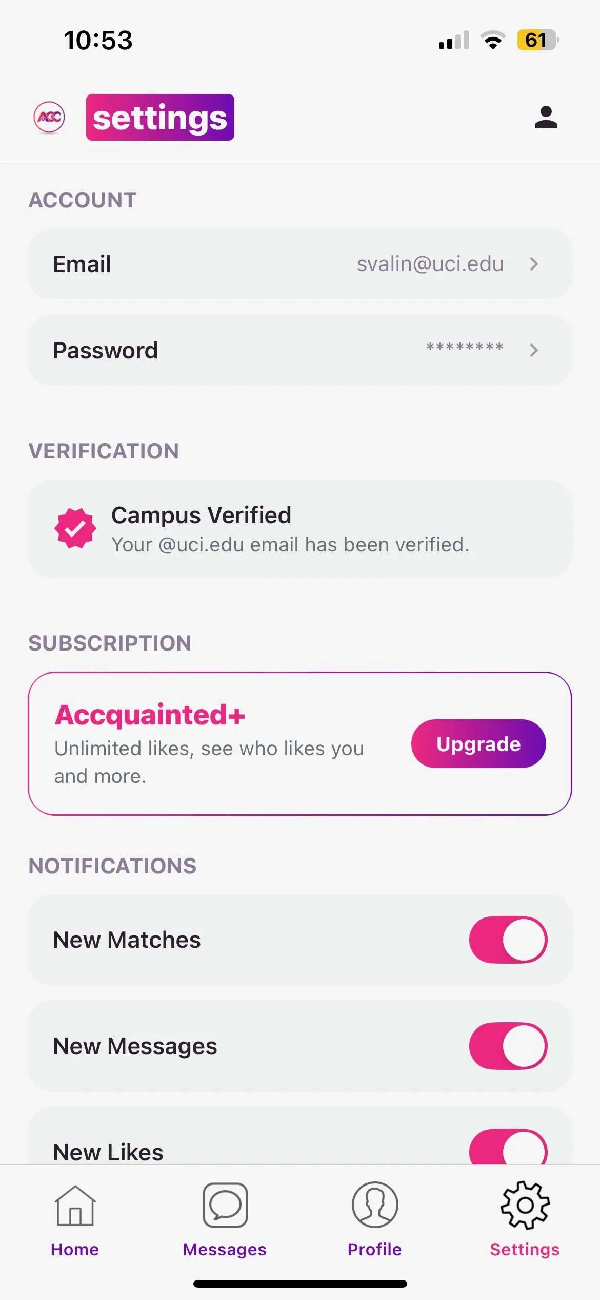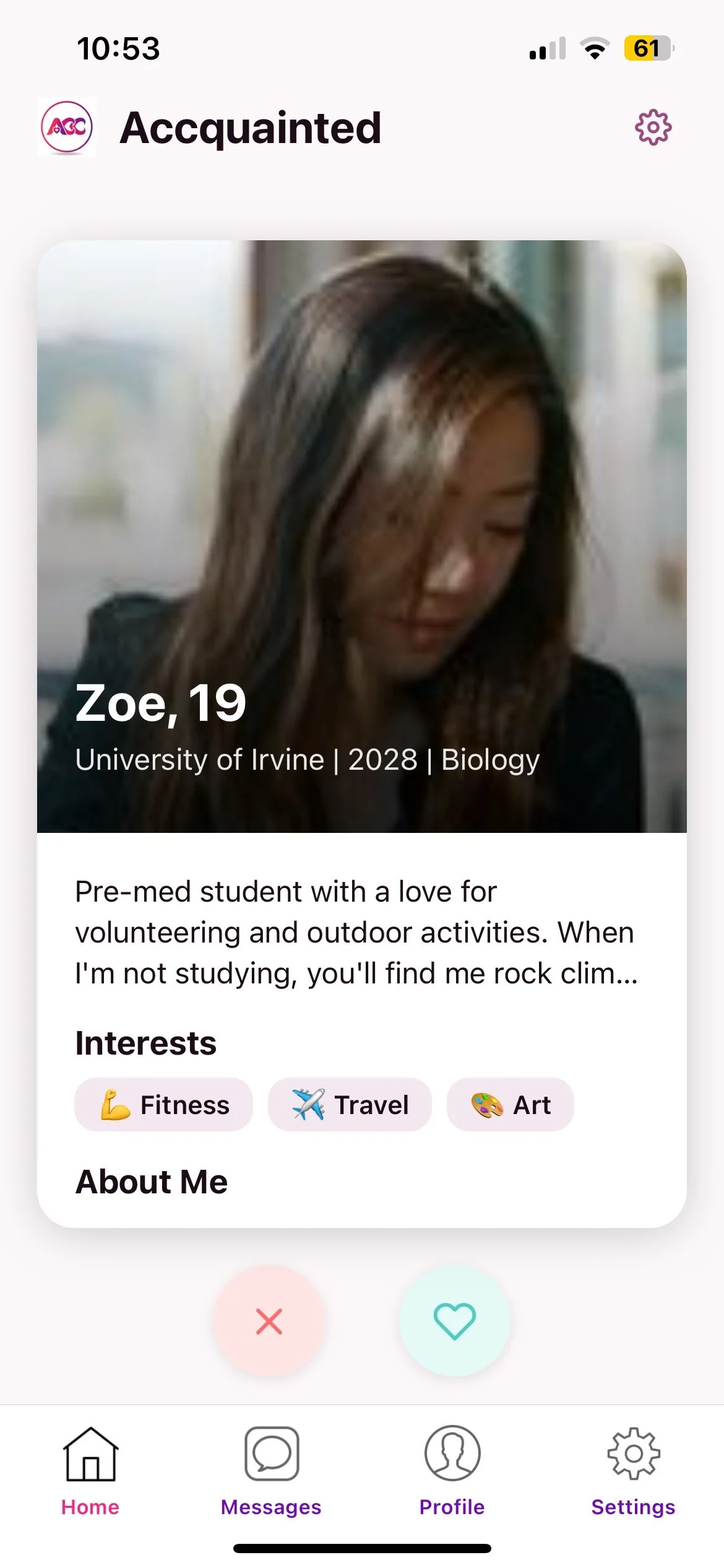 Accquainted started as a passion project by UCI students who wanted something more real than endless swiping. We’re blending good design, real safety, and a touch of campus spirit into every update.